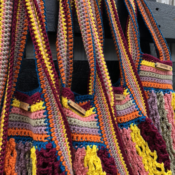 I’d never claim that the pattern I use is my own, I use one that I found on the WeAreKnitters website. They are one of my main yarn suppliers and I simply love using their cotton to make these bags. I do however, play around with the pattern occasionally and change the way I make them depending on the colours or the materials. (I write my own patterns too, and am adding them to my website all the time. Check back occasionally to see what’s new!)